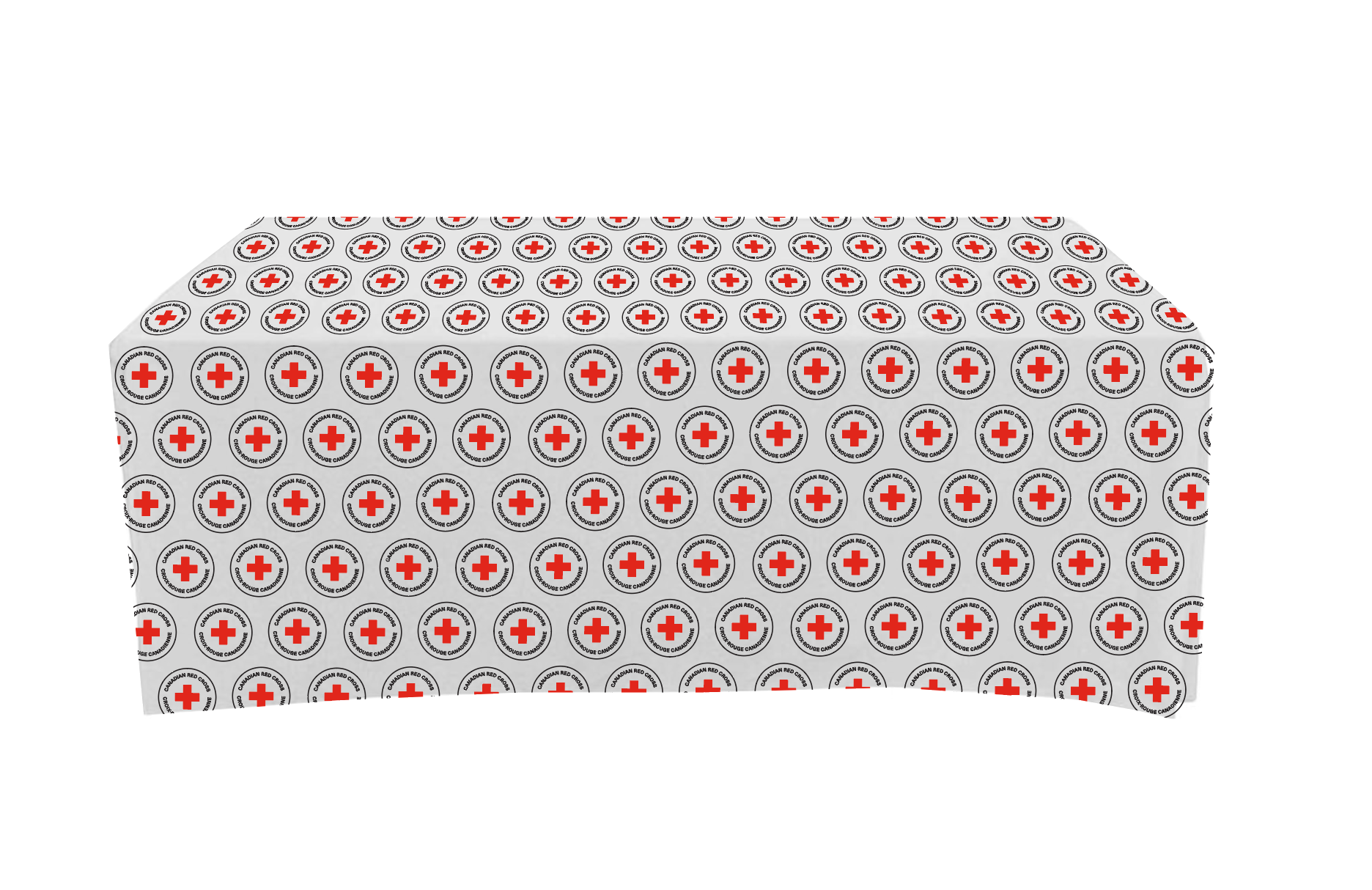 Sized to fit a 6ft table. Four-sided (closed back). Seamless. 100% polyester. Machine washable, wrinkle resistant and fire retardant.