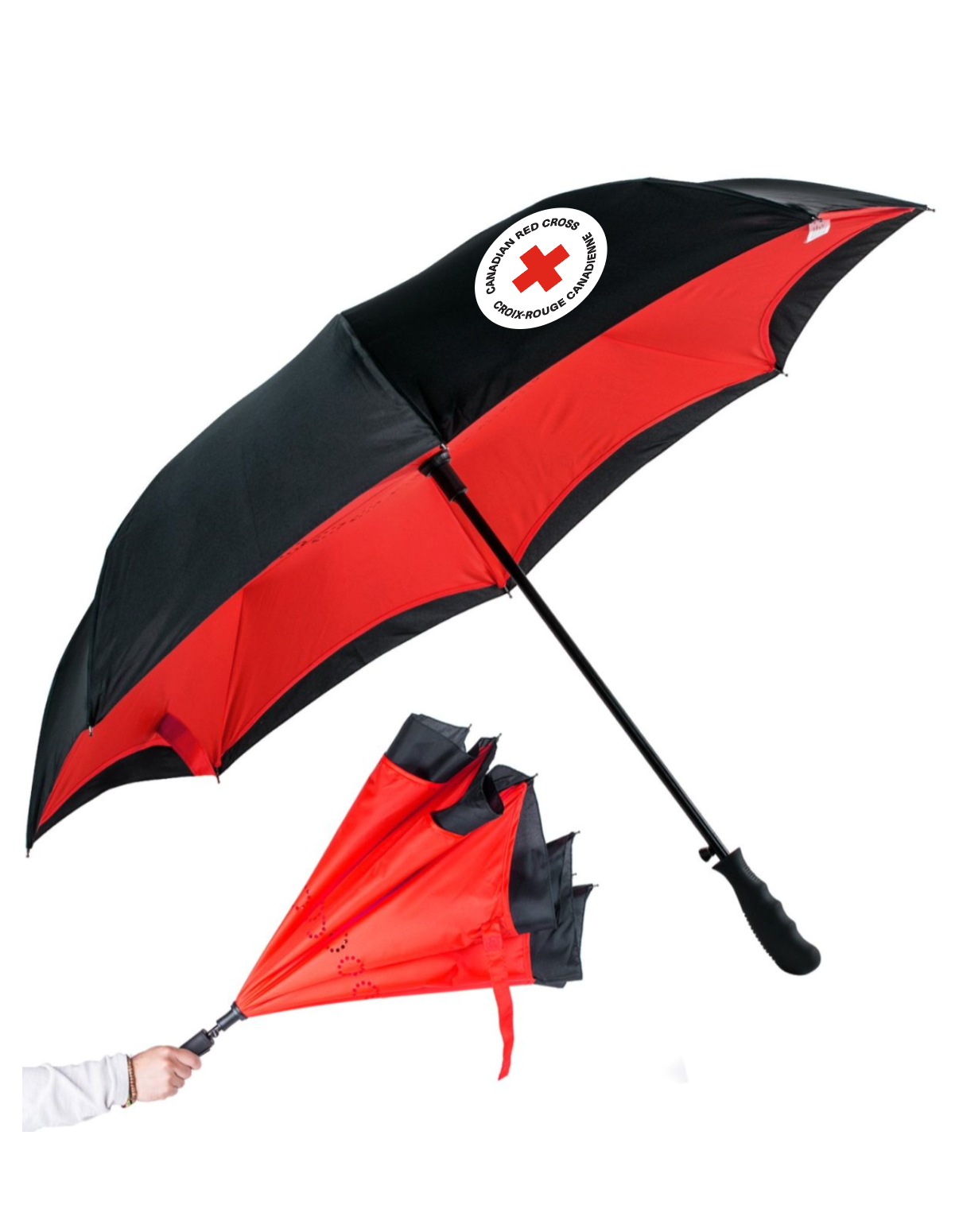 A revolutionary inverted closing design pushes the water away when closing, makes it easy, fast and hassle free to get in your vehicle and through the front door while keeping you dry. Plus only the dry side of the umbrella is exposed once you're indoors. 48" arc, automatic closing, pongee material, rubber grip handle. Closed length is 31". Steel shaft, fiberglass ribs.